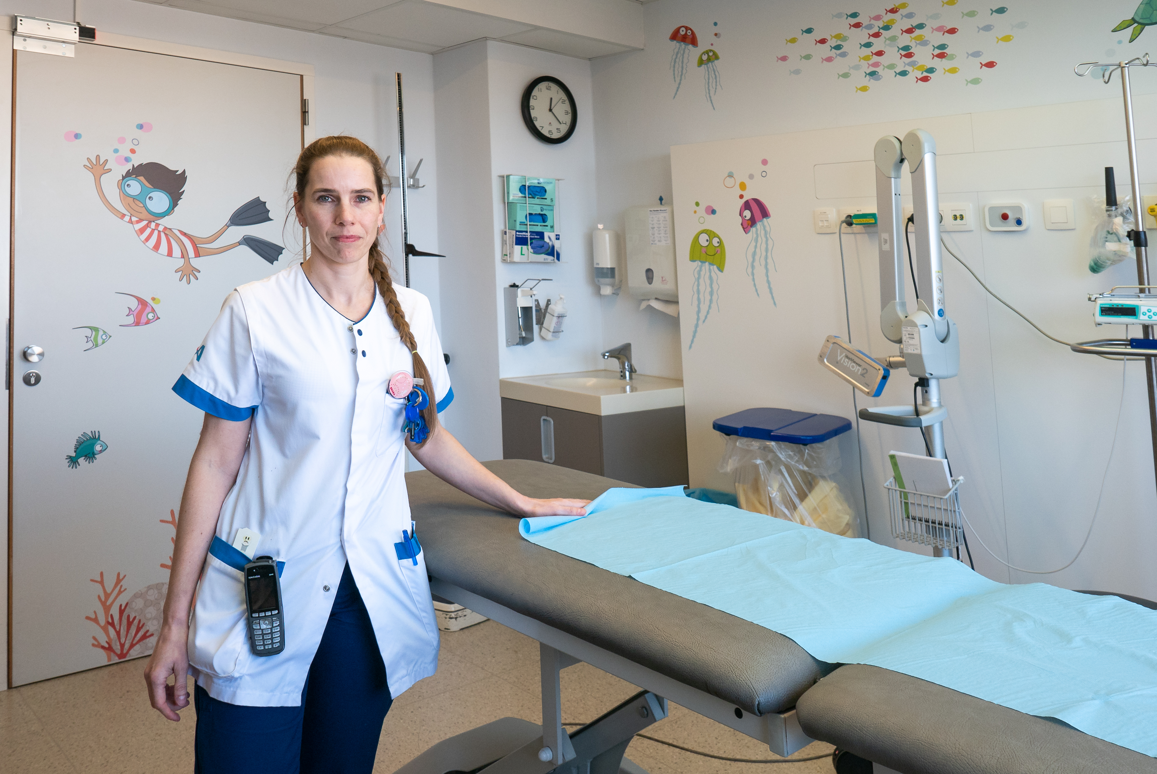 In de onderzoekskamer kan de verpleegkundige bijv. wat bloed afnemen. Gelukkig zijn hier voldoende zaken om jouw aandacht af te leiden zoals een tv-scherm, VR-bril en lichtplafond die jou helemaal tot in de onderwaterwereld brengt.
