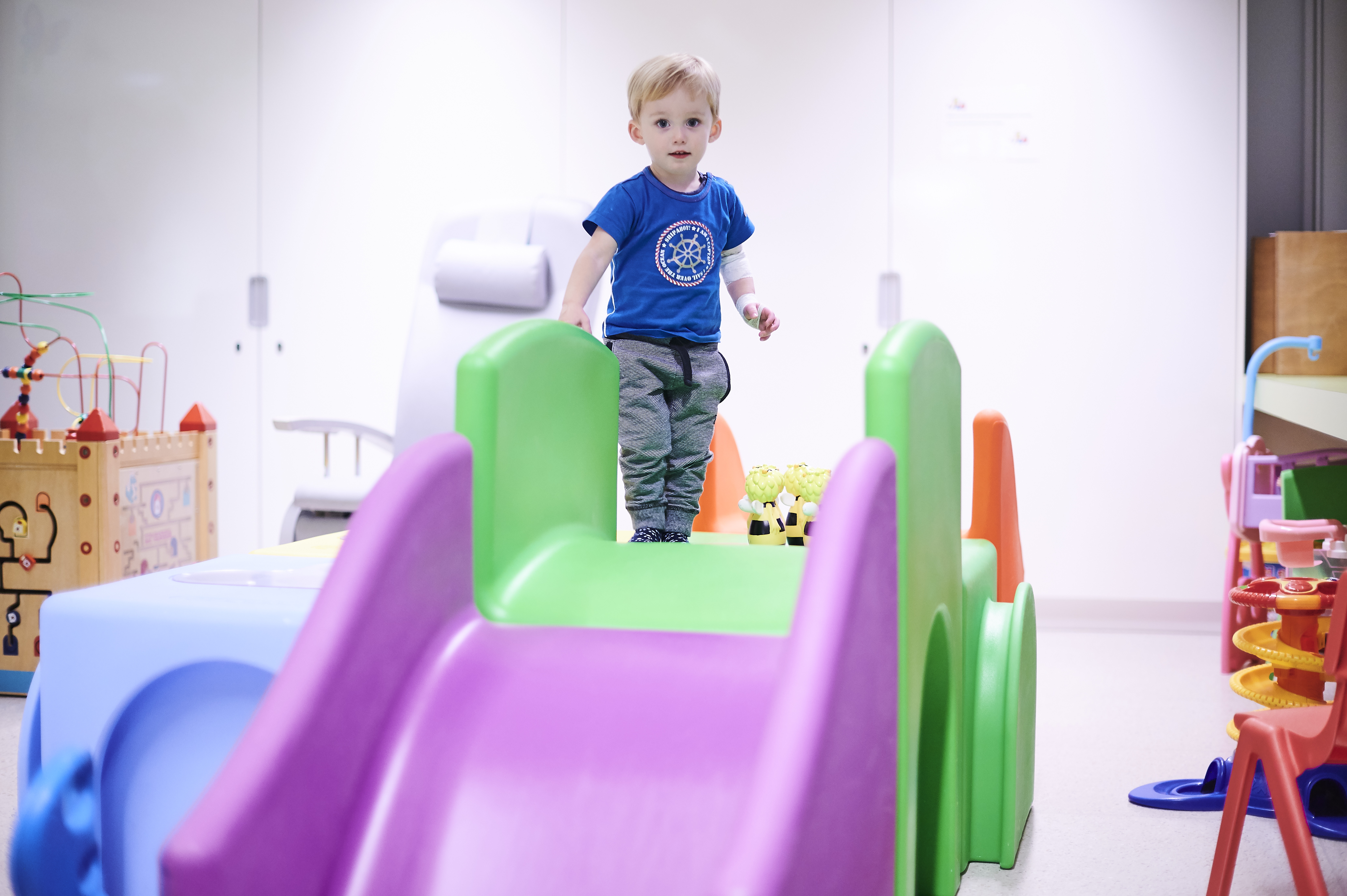 In de speelkamer kan je je helemaal uitleven op de klimblokken, je kan rondrijden met een van de speelgoedauto's of je terugtrekken met wat speelgoed of kleurpotloodjes.